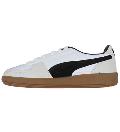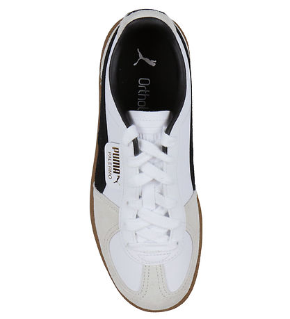 Cool Puma shoes in white leather and suede with black logos on the sides and on the heel.