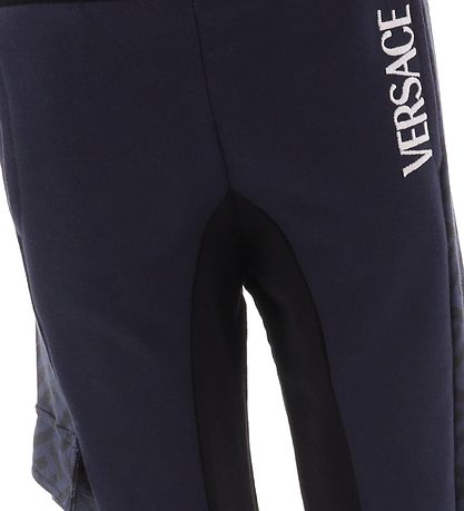 Beautiful Versace sweatpants in navy, and the edges and inside of the trouser legs are black. Down the outside of the trouser legs there is a black print with black meander borders with a 3d look.