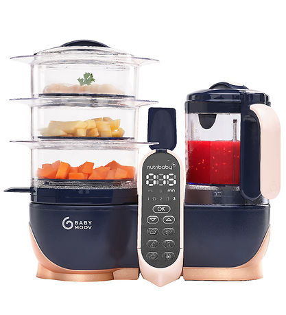 Smart Babymoov food machine in the model Nutribaby+ XL in a pink and dark blue color theme, which contains as many as six different functions in one and the same machine, all of which make everyday life easier for families with children.