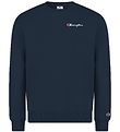 Cool Champion sweatshirt in navy blue, with "Champion" embroidered in white on the left chest and a logo in white and green embroidered above the left wrist.