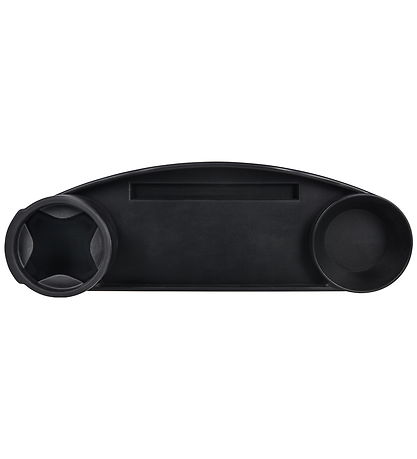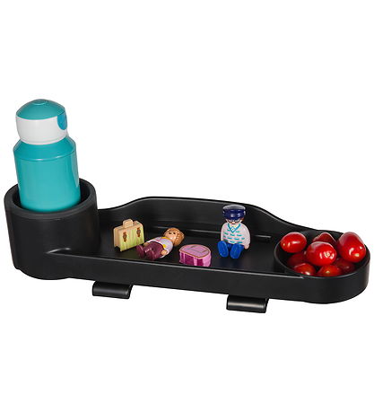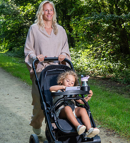 The Dooky tray table is mounted on the front of the stroller instead of the front bar or on the handlebars of the stroller with Velcro straps on the underside of the tray. The tray is made of plastic with high edges, so you can put toys or on the table for the kid. On one side there is space for a cup, and on the other side there is a recess for snacks. There is also a crack where you can place a mobile phone so that it stands stable - either to entertain the kid or the adult.