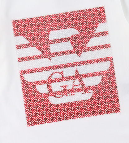 Beautiful Emporio Armani blouse in white, and in front there is a large square made of sequins in shades of red and a logo in white.