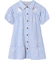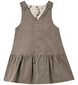 Elegant Fliink dress in off white brook and wave with heart print in red. The Dress has a round, elastic neckline and long sleeves with ruffled ends. There are ruffle details at the shoulders, and the dress has good width in the skirt.