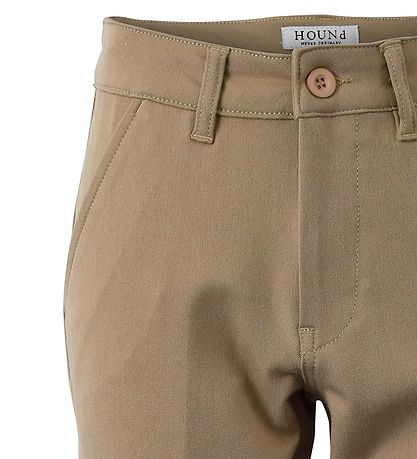 The hound chinos have a wide edge at the waist with a sewn-in, adjustable elastic that is set on the inside. At the front there are two pockets, and at the back there are two decorative cheat pockets. At the edge of the legs there are fine, sewn-on curls. The chinos are opened at the front with a button and a zipper, and there are practical belt loops around the waistline.