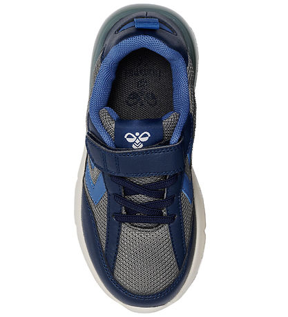 Smart Hummel shoes made of imitation leather and textile in blue and grey shades. On the inside and outside are the characteristic Hummel shevrons in blue. On the heel there is a detail of an area in blue that flashes every time the kid takes a step.