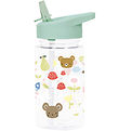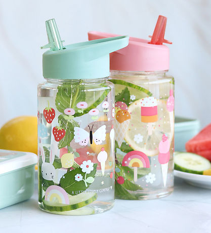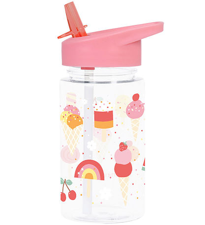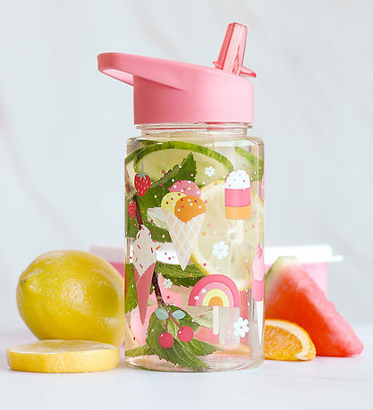 Beautiful A Little Lovely Company water bottle in transparent plastic, with a print of ice cream, berries and small dots in fine shades. The lid is pink.