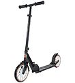 The Longway scooter in the Summit Mini pro model is well suited for smaller kids. It's a good trick scooter for skateparks and ramps. The footplate has a ruffled surface so that the kid stands safely on it. The handles provide a good handles and there is a flex fender brake on the rear wheel. The wheels are in hard rubber.