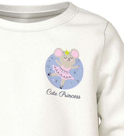 Charming Name It blouse with long sleeves in a light cream white. The Blouse has a round neckline and is decorated with a cute print of a mouse wearing a little crown and tutu, accompanied by the text "Cute Princess". This blouse is simple in its design with a slightly curved finish at the bottom.