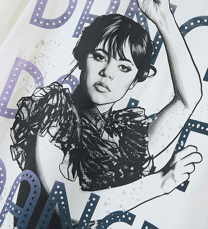 Nice Name It t-shirt in white. The T-shirt has an eye-catching print with the text "WEDNESDAY" on the front in black. On the back there is a large print of a dancing character from "Wednesday" with the text "DANCE DANCE DANCE"