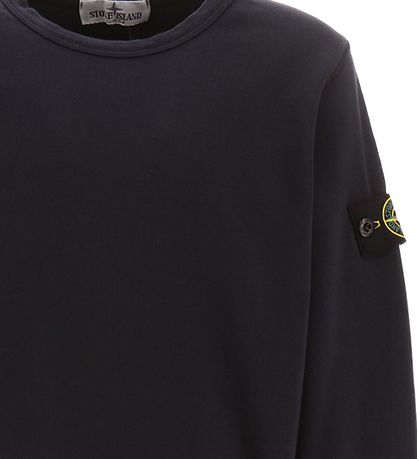 Nice Stone Island sweatshirt in plain dark navy, and the iconic logo mark is fixed with buttons at the top of the left sleeve.