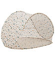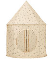 The Vilac play tent consists of a large room that can be opens and closed at the front with drawstrings. The window can be rolled for on the outside, with a piece of fabric and a drawstring. It is recommended to use the play tent for outdoor use.