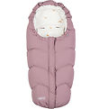 The footmuff is opened down the front with a zipper that can be opened both from above and below. It can also be opened at the bottom, and the entire bottom can be zipped off, and the bottom piece can be replaced with a longer extension part so that the footmuff can grow with the kid.