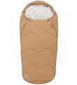 The footmuff is lined with soft, light grey fleece, and in the upper part it is padded with down and feathers. In the back there is a nice temperature-regulating wool lining, which conducts moisture away from a kid's body, while creating a stable and comfortable temperature. On the front and around the bottom of the footmuff there are practical reflectors.