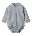 The Wheat bodysuit has long sleeves and fine details such as small ruffles at the wrists and lace edging at the neck, which gives an elegant look. It has a practical closure with push buttons over the left shoulder and between the legs.