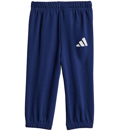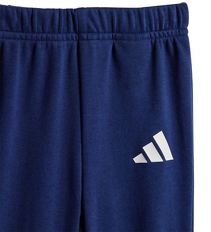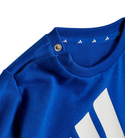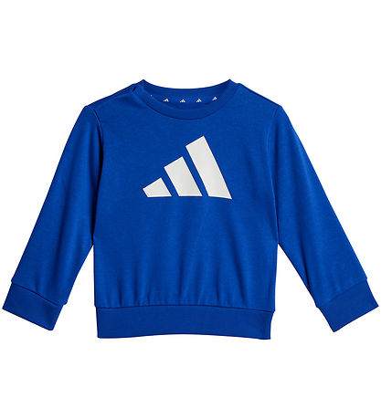 Smart adidas Performance sweat set consisting of a cobalt blue sweatshirt with a large, white logo print on the front and a pair of dark blue sweatpants with a white logo print on the left thigh.