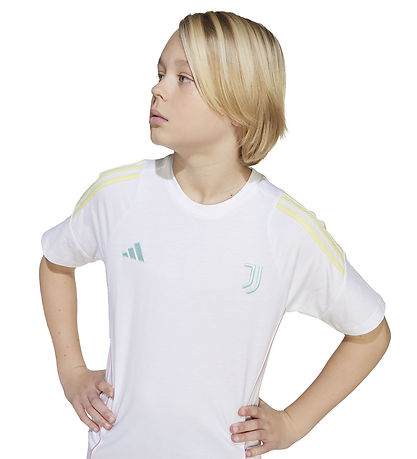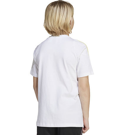 Beautiful adidas Performance t-shirt in a classic white colour with embroidered logos placed on the chest in a light blue colour. The T-shirt has contrasting details with the characteristic three stripes in light yellow over the shoulders and pink stripes down the sides.