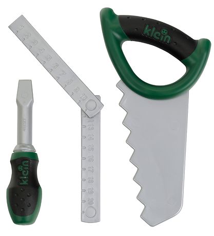Fun Bosch Mini tool set consisting of a saw, a screwdriver and a ruler in shades of grey and green.