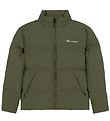 Lovely Champion Fashion puffer jacket in plain black, and at the top left side it says "Champion" printed in white.