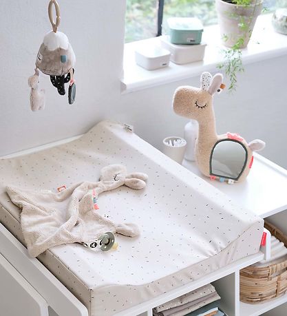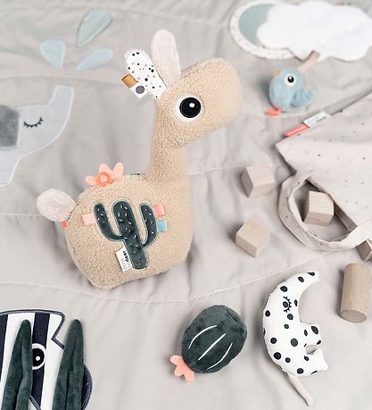 The Done By Deer activity toys toy has a large mirror on one side and the llama's ears and tail and ears rattle and around there are others small, fun activities that little fingers can grab. The llama is filled with sand so it stays standing without tipping over.