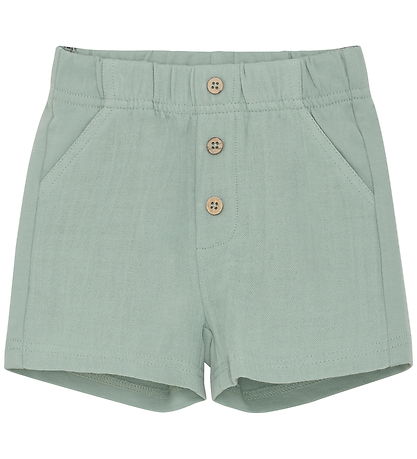Stylish En Fant shorts in a soft, green shade with a muslin structure at the front and sweat fabric at the back. En Fant shorts have an elastic waist and three decorative buttons at the front, as well as practical slant pockets.