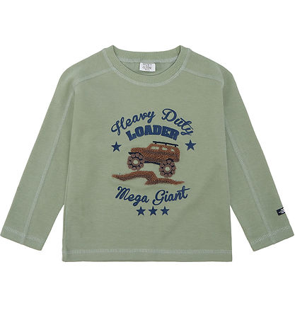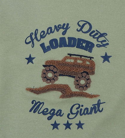Practical Hust and Claire blouse in a dusty green colour. The Blouse has an eye-catching print of a car in soft brown plys, which is for off-road driving and the text "Heavy Duty LOADER" on the front, which gives an exciting expression.
