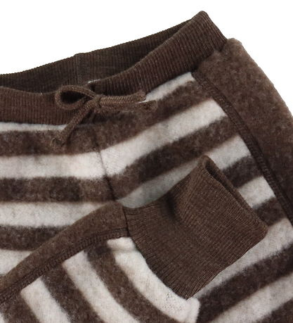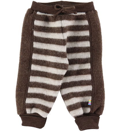 The soft Joha trousers have beige and dark brown stripes and are solid dark brown along the side.