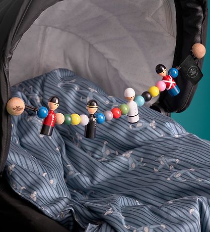 The Kay Bojesen pram chain consists of a strong, black elastic band with wooden clips at the ends, which make it easy to attach to the pram's canopy.