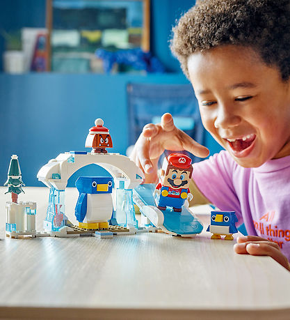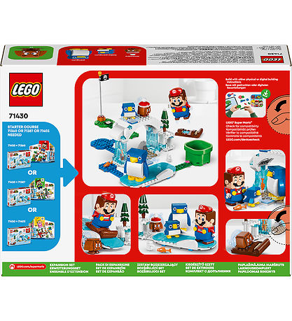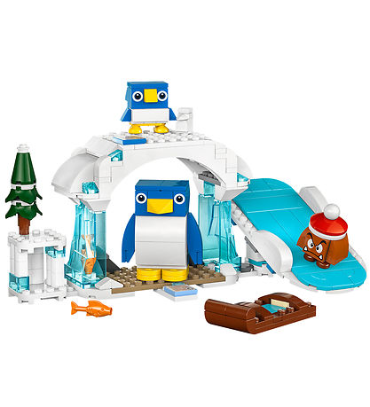 With the LEGO® Super Mario expansion set, another cool challenge can be added to the existing collection of LEGO® Super Mario courses. This expansion set includes three toy figurine of a brick-built penguin, a baby penguin and a Goomba figure with a winter hat, as well as a buildable ice cave, an "ice"rollercoaster that turns into an ice rink, two fish figures and a snow sled.
