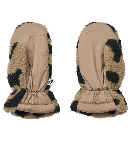 Smart Liewood mittens in brown with a black leopard pattern. The Mittens are made of lovely teddy fleece.
