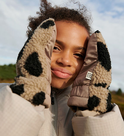 The Liewood mittens have a thumb and they have a narrow elastic around the wrist. On the inside, the mittens have brown, smooth-woven textile. The Mittens are lined with black fleece.