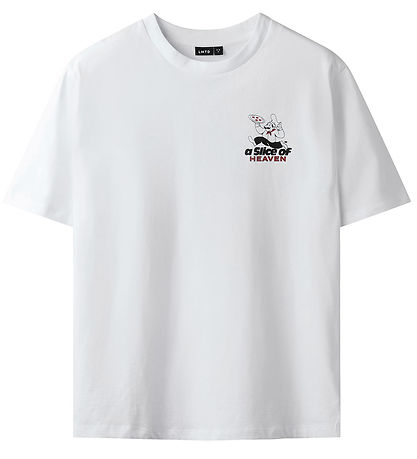 Smart LMTD t-shirt in white with a fun pizza print in black and red and the text "A Slice Of Heaven" on the front. On the back is a similar print in a large version. The T-shirt has a round neckline with ribbed trim and short sleeves.