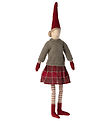 Charming Maileg Christmas mouse with a striped knitted blouse in red and grey, as well as green trousers and a removable christmas hat.