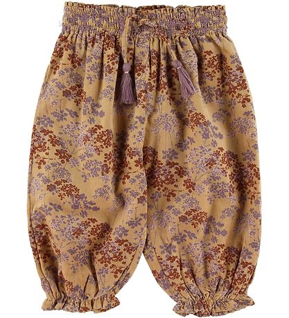 Fine Mini A Ture trousers in dark curry yellow with an allover floral print in dark red and purple and at the front are decorative, purple embroideries at the waist and a tie with purple tassels. The trousers are made of light and fine corduroy.