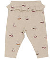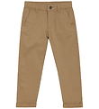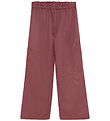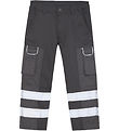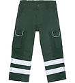 Practical Minymo trousers in a deep green shade with reflective stripes at the bottom of the legs. The Trousers have several pockets and a modern cut that makes them both functional and stylish.