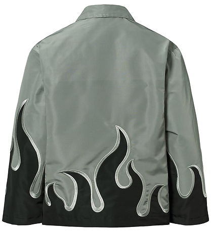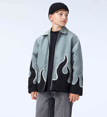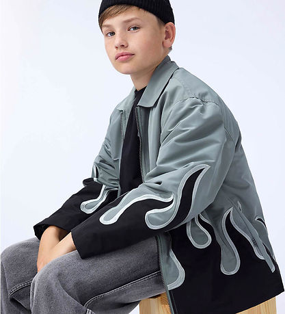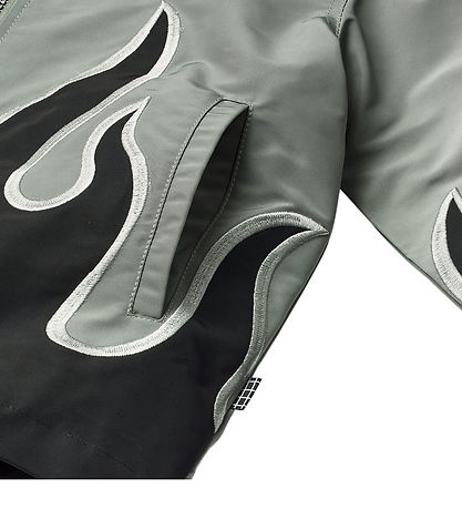 Beautiful Molo jacket in dusty green with a print of flames at the bottom in black with silver edges. The Jacket has a collar and closes with a zipper at the front. It has long sleeves and pockets at the front with a nice fleece lining inside. The Jacket has a light polyester padding, which makes it good for the transitional months.