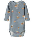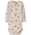 Lovely Name It bodysuit in a light green shade with long sleeves and practical push buttons. The Name It bodysuit has a cute print with animals in a car and the text "Nice Day" on the front.