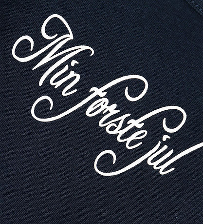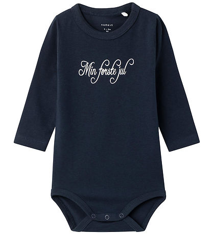 Cute Name It bodysuit in dark blue with a fine white text print on the chest that says "My first Christmas".