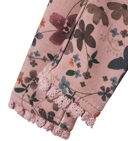 Charming Name It leggings with a beautiful floral print in shades of purple, blue and orange. The Name It leggings have an elastic waist and a tight fit that ensures a comfortable experience. the leg openings have beautiful lace.