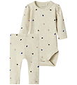 Charming Name It set consisting of a bodysuit and sweatpants. The Bodysuit has long sleeves and is in a soft white colour, with a cute print of a unicorn with a flower crown on the chest. The Name It sweatpants are in beige with an all-over-print of unicorns.