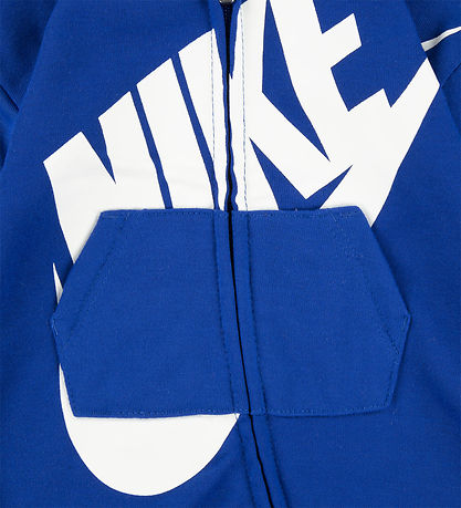 Fantastic Nike jumpsuit in a ready blue colour with a large logo print in white on the front. The Jumpsuit is made of sweat quality with a soft hood and a full-length zipper from the chin to the left foot. The Jumpsuit has long sleeves and long legs with wide ribbed edges. There is a fake pocket on the front.