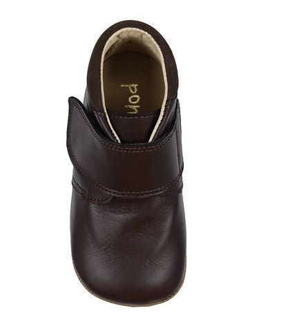 Stylish Pom Pom soft sole leather shoes in glossy, dark brown leather.