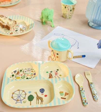 Smart Rice dinner set in off white and light blue with a colorful circus print.