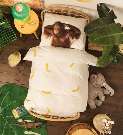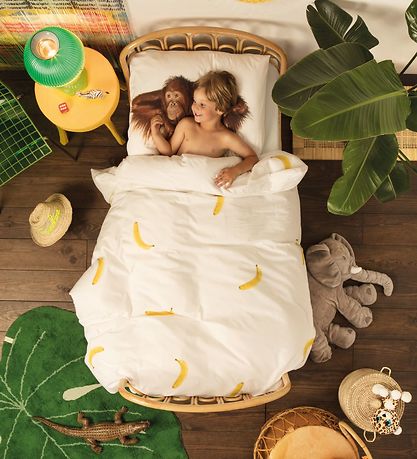 Fine Snurk bed set in white, with yellow bananas printed on the duvet cover. There is a monkey on the cushion, so it looks as if the monkey is under the duvet.
