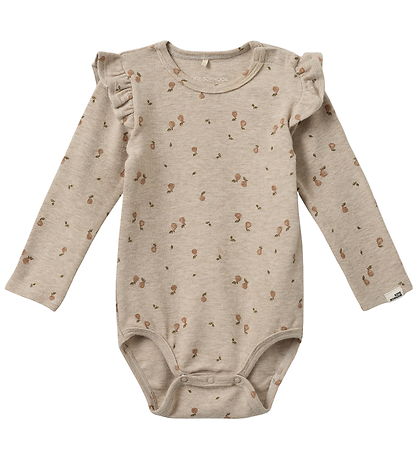 Charming Sofie Schnoor bodysuit in a soft melange beige with a beautiful print of pears in shades of rose and green. The design is highlighted by fine ruffle details at the shoulders, which give an elegant touch.