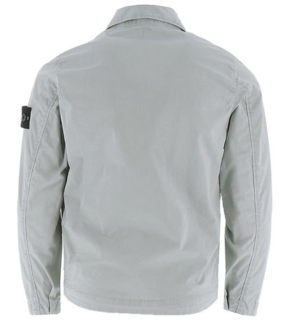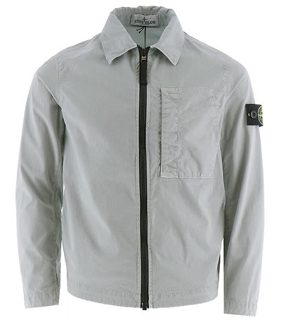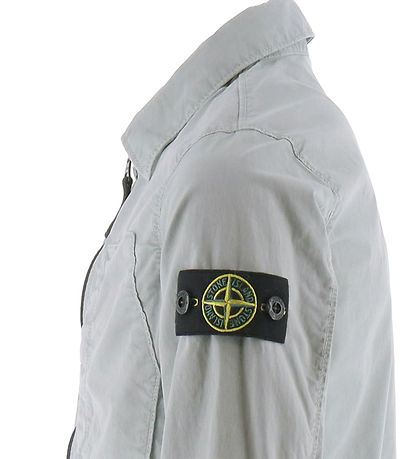 Smart Stone Island jacket in plain light grey in a light, stretchy cotton quality and with a black zipper. At the top of the left sleeve, the iconic logo badge is fixed with buttons.