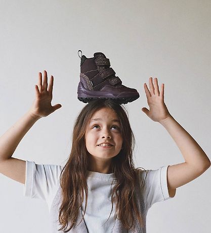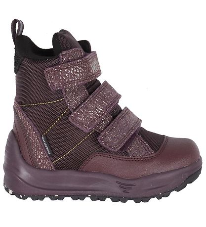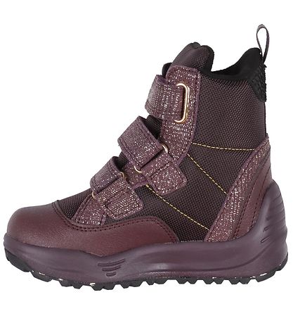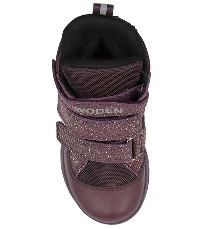 Beautiful Woden winter boots in plum textile with fine details of light brown stitching, black leather and plum suede with glitter. On the back of the boot there is black fish leather and a practical reflector, so it is easier to see the kid in the dark. The outer sole is plum with a black bottom.