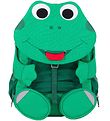 Cute Affenzahn backpack in shades of green, shaped like a bear. In front there are two ears, eyes and a mouth that extends tongue. The tongue is attached with an elastic band, and when you pull it, a name tag comes into view.