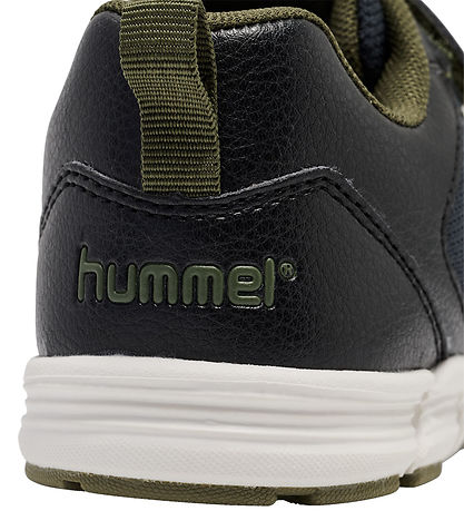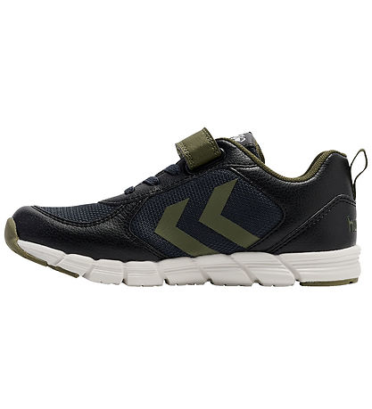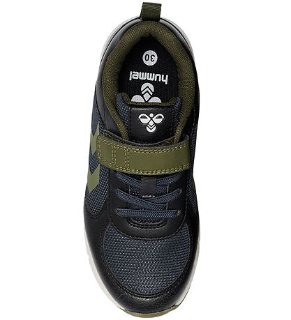 Practical Hummel shoes in black mesh and imitation leather with dark green logos and details.