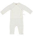 Elegant MarMar jumpsuit in plain white. The MarMar jumpsuit has long sleeves and legs with fixed feet that create a whole. It opens easily with push buttons along the side, making it practical to use.
