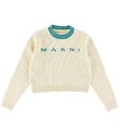 Beautiful Marni blouse in grey melange knitted with turquoise edges on the sleeves and in the neckline, and at the bottom it is navy. At the front is "Marni" with turquoise letters.